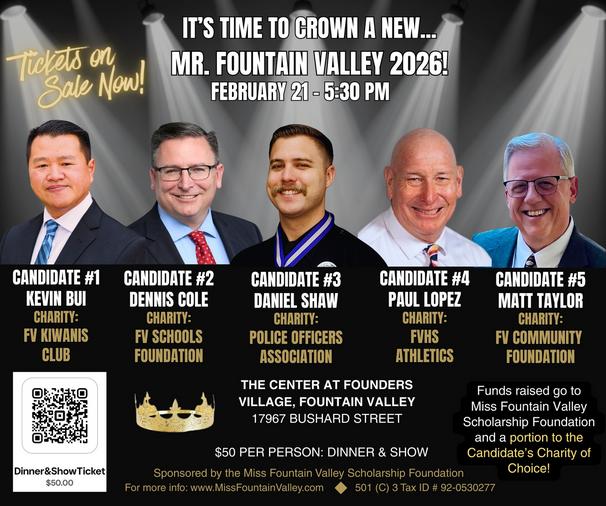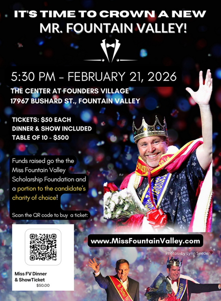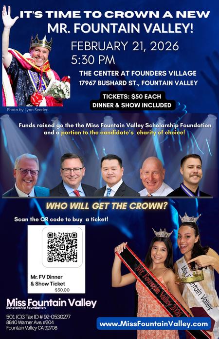 Save the Date for our Mr. Fountain Valley Fundraiser on Feb. 21, 2026.